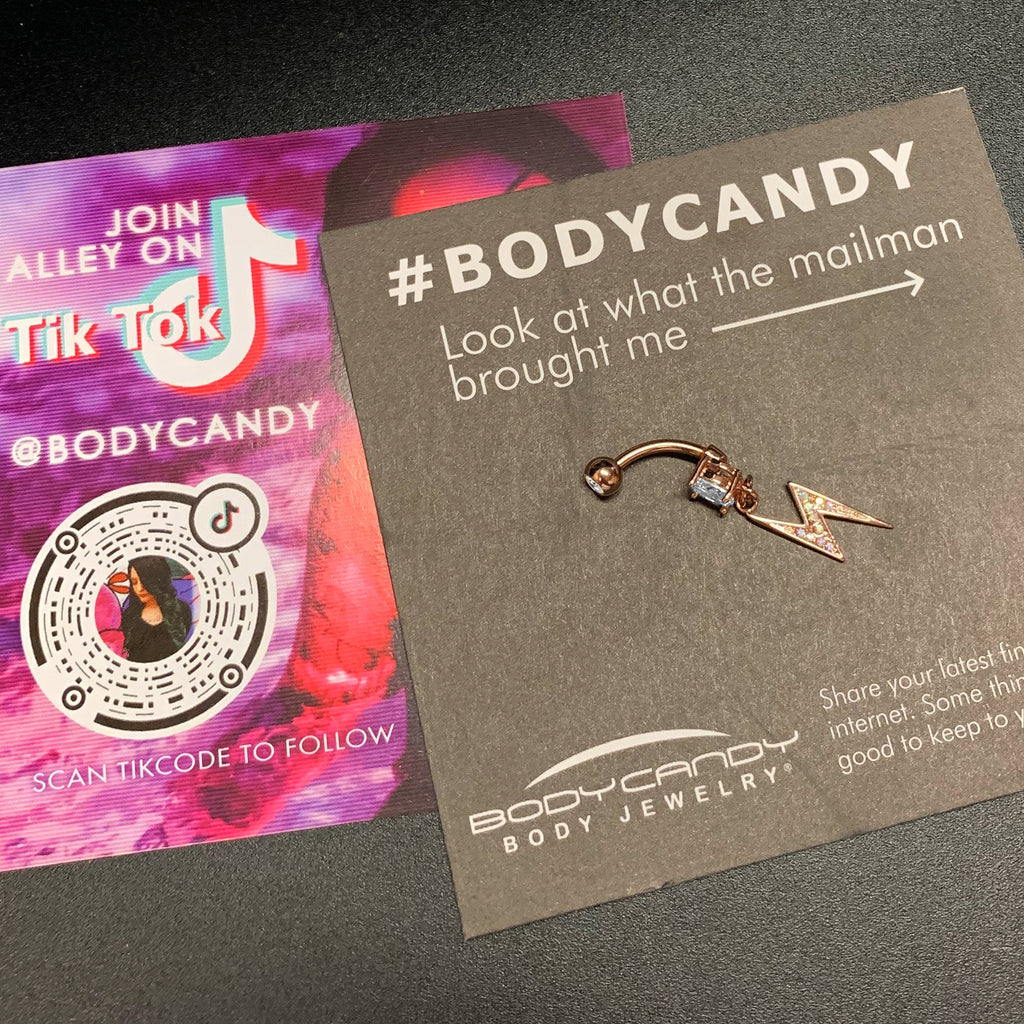 Let lightning strike your look with glam style when you're rocking this 14 gauge navel ring! It's made with a 3/8" rose gold tone PVD over 316L surgical curved barbell with a 5mm top ball end, which is set with a clear gem. The bottom end features a single large clear gem for a cohesive appearance. Dangling from the bottom is a lightning bolt charm, set with aurora cubic zirconia gems for an added strike of color. Your look will light up the skies with this super stylish lightning bolt belly piercing jewelry!Specifications