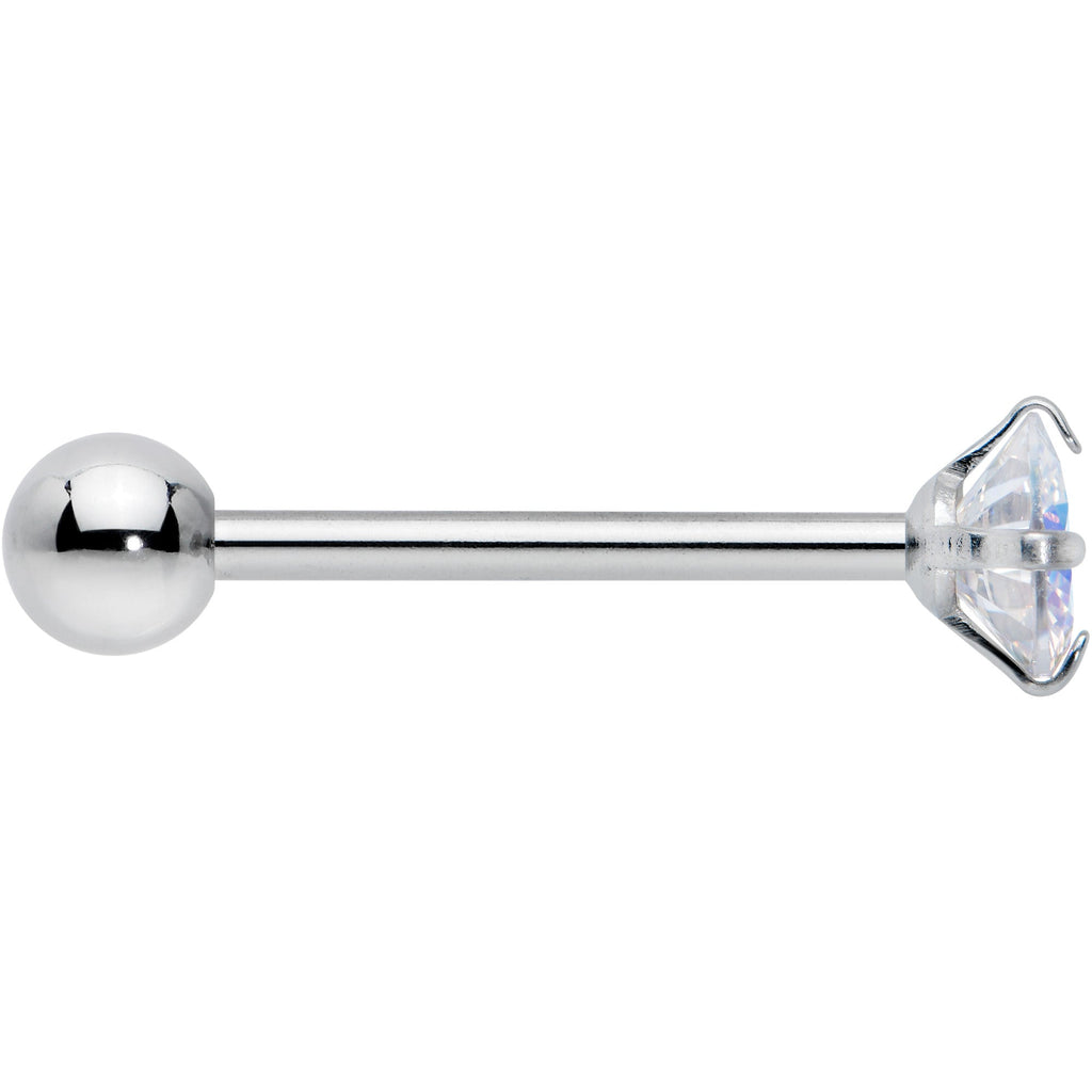 Add some understated elegance to your look with this striking 14 gauge tongue jewelry! It's made with a 5/8" durable 316L surgical grade stainless steel straight barbell with a 5mm bottom ball end. The top end features a round aurora cubic zirconia gem, for a look that's both classic and colorful. This simple beauty is sure to be the jewel of your collection when you're rocking this classic tongue piercing ring!Specifications