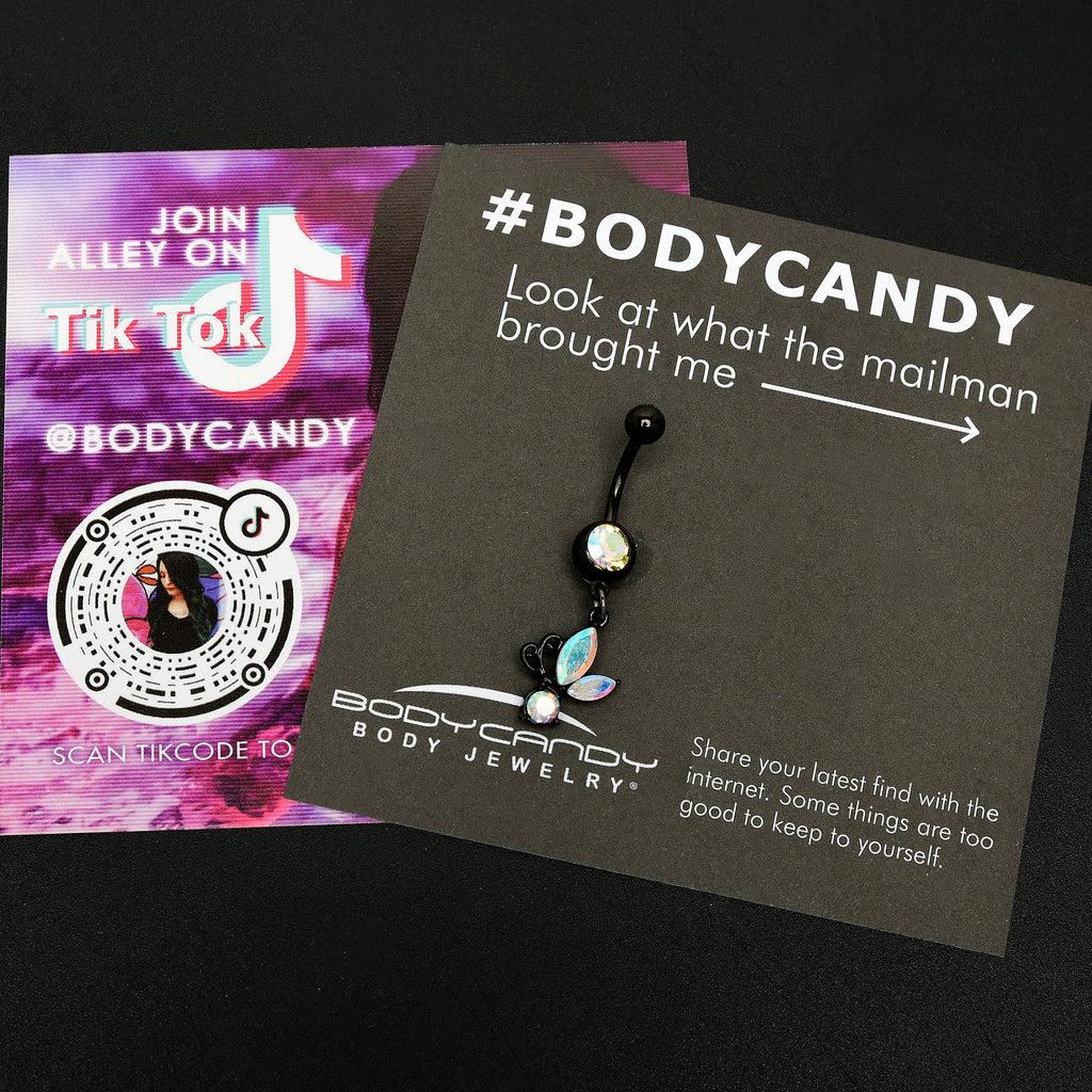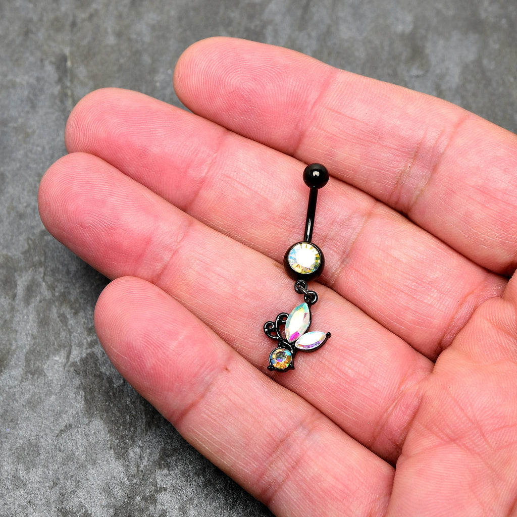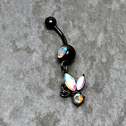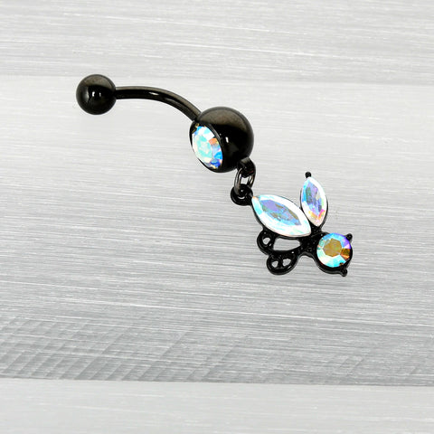 Get a look that wouldn't be out of place in any throne room with this 14 gauge navel ring! It's made with a 3/8" black PVD over 316L surgical grade stainless steel curved barbell with a 5mm top ball end. The bottom ball end is 8mm and set with a large aurora gem. Dangling beneath it is a stylized fleur de lis charm, composed of aurora gems. The abstracted style adds a modern touch to a timeless symbol - for a look that's perfect for all occasions. Mix antique and modern for a look that's very now with this elegant belly piercing ring!Specifications