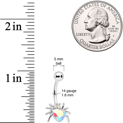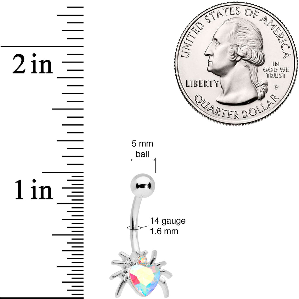 This spider body jewelry will give you the Halloween shivers.....but not shivers of fear! This 14 gauge navel ring is made with a 7/16" durable 316L surgical grade stainless steel curved barbell and has a 5mm top ball end. The bottom end is a spider charm with the body made of a Valentine's Day heart-shaped aurora gem and the head composed of a smaller aurora gem. So whether you cherish creepy crawlies or appreciate arachnids, this belly button ring is sure to snare you in its web!Specifications