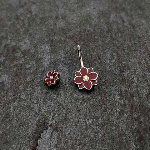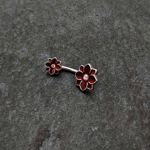 Double your belly button piercing's "wow" factor with this 14 gauge navel ring! It's made with a 3/8" durable 316L surgical grade stainless steel curved barbell. The top end features a poinsettia flower charm with the petals inlaid in deep burgundy red and an aurora gem center. The bottom end features an identical flower charm in a larger size. And of course, you can turn it around and wear it with the larger flower on top if you prefer! With such glamorous styling and thoughtful details, this is one belly ring that is sure to wow you!