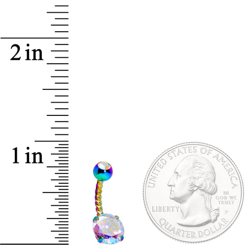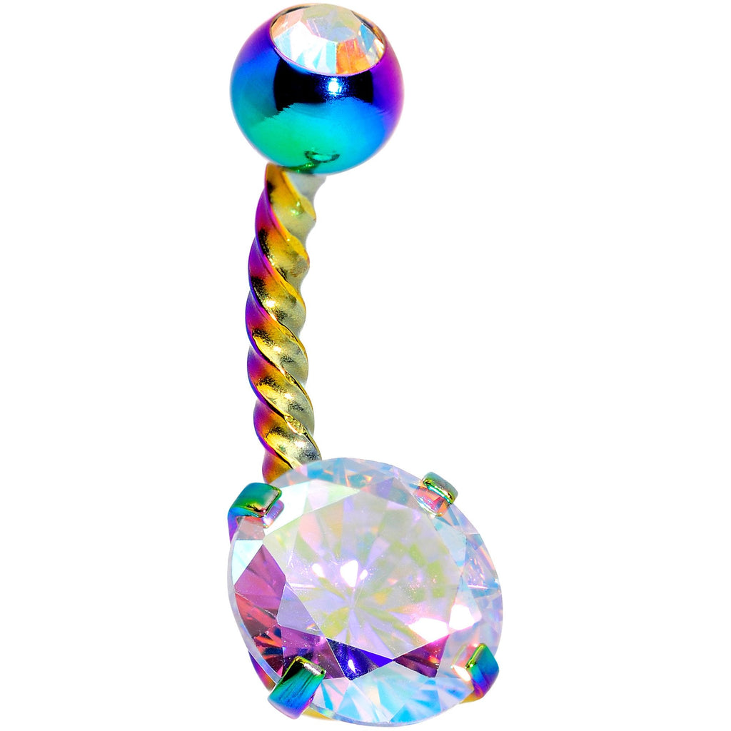 This pair of 14 gauge navel rings packs a whole lot flair into a small package! You get two belly rings made with 7/16" rainbow anodized over 316L surgical grade stainless steel twisted curved barbells. The first features a 5mm top ball end set with a small clear gem and a base made entirely of a large clear gem for a look of elegance and style. The second one features a 5mm top ball end and an 8mm bottom ball end, both set with aurora gems for a slightly more subdued look that is still eye-catching and thoroughly on-trend. Follow the rainbow right to these twisted belly rings! Sold as a set of two.Specifications