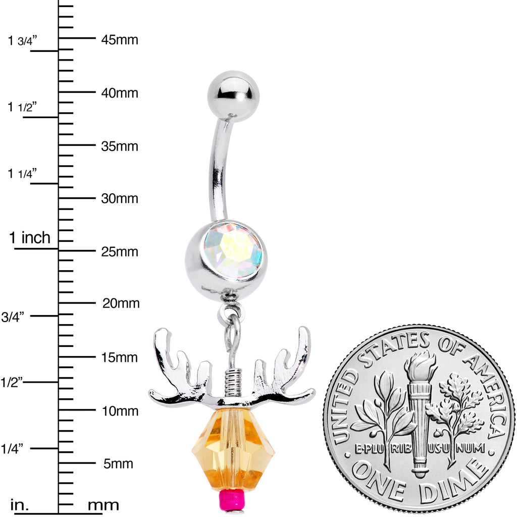 Rock a red nosed reindeer in your navel piercing with this 14 gauge belly button ring! It's made with a 3/8" durable 316L surgical grade stainless steel curved barbell with a 5mm top ball end. The bottom ball end is 8mm and set with a large aurora color gem. Dangling beneath the bottom ball end is a reindeer's head. The reindeer is composed of a faceted tan gem, with a red gem nose. It's embellished with antlers for a true feeling of the holiday spirit! Let this reindeer bring a sleigh full of festive holiday cheer to your ear with this winter themed navel ring!