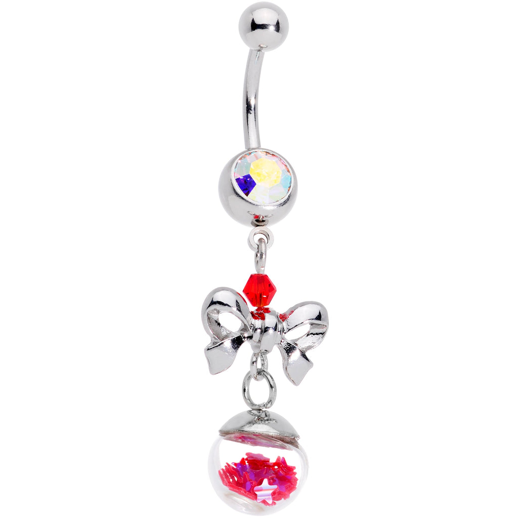 Wrap your belly piercing with a holiday bow with this 14 gauge navel ring! It's made with a 3/8" durable 316L surgical grade stainless steel curved barbell with a 5mm top ball end. The bottom ball end is 8mm and set with a large aurora color gem. Dangling beneath it is a red gem just above a bow charm, in matching silver tone. Beneath the bow is a dangling clear globe that contains red "snow" and aurora star-shaped glitter. You'll have an entire holiday look in one with this festive snow globe belly button ring!Specifications