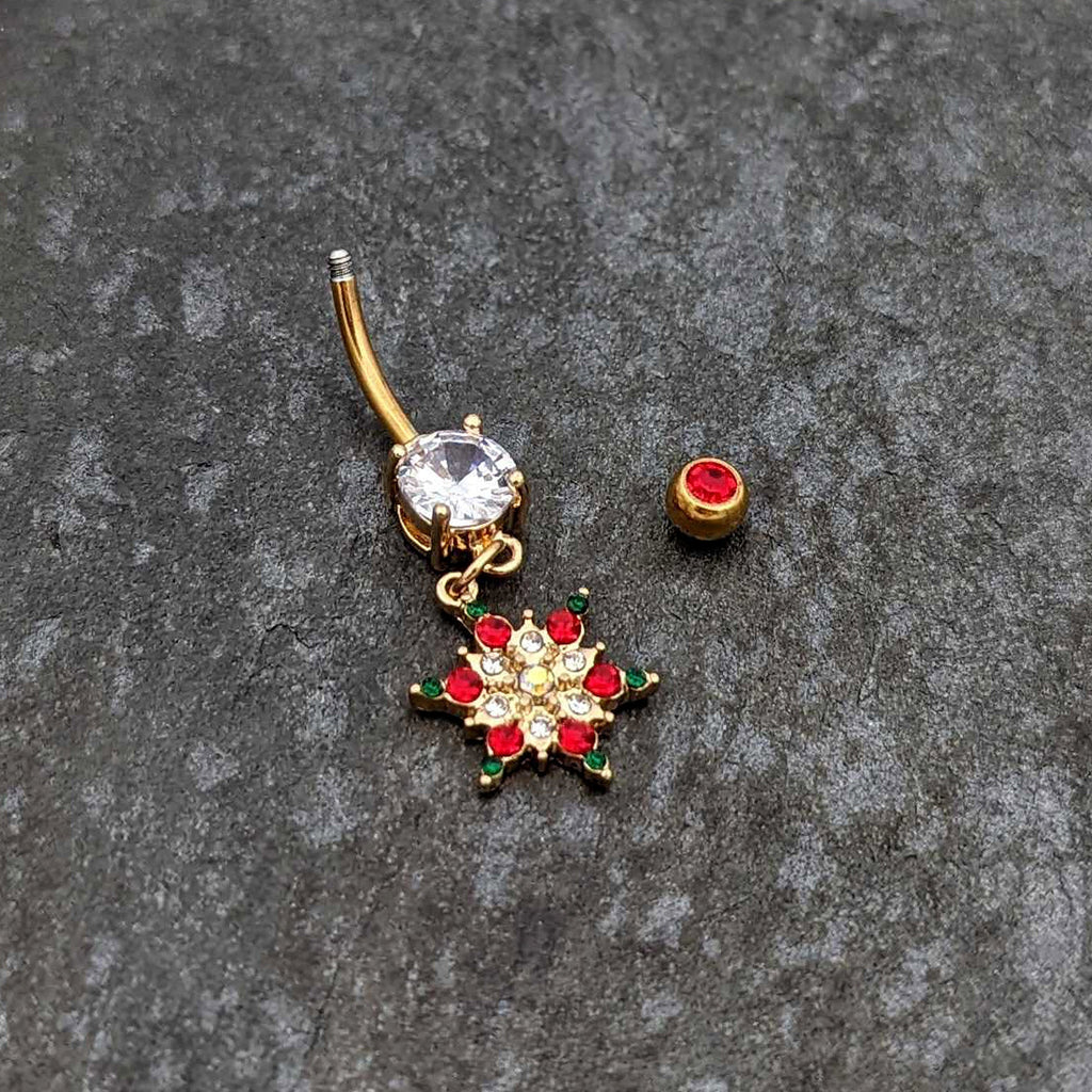 Get into the festive spirit with this 14 gauge navel ring! It's made with a 3/8" gold tone PVD over 316L surgical grade stainless steel curved barbell. The top ball end is 5mm and set with a red gem while the bottom end is composed of a single large clear gem. Dangling beneath it is an ornate star charm, set with red and green gems at the points. It is further embellished with a ring of clear gems around the middle and an aurora gem center. Sport a star for the holidays with this fabulous, festive belly piercing jewelry!Specifications