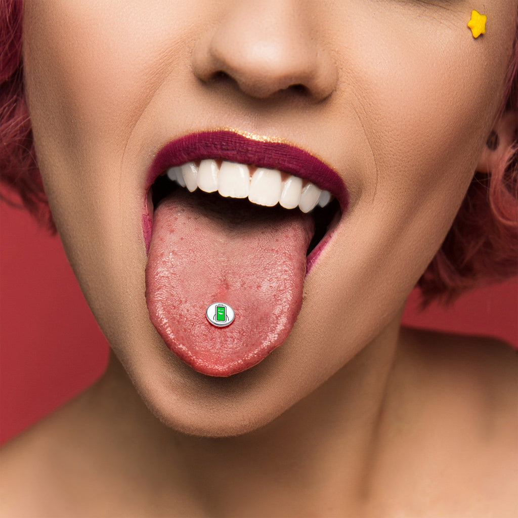 If you are all charged up and raring to go, this tongue jewelry is perfect for you. It is made with a 5/8 inch 316L surgical grade stainless steel straight barbell with a 5mm bottom ball end. It features a white disc with a battery icon on it. The battery is green and fully charged and looks appropriately pleased with the situation. Let the world know that nothing can drain your energy with this cheery charged battery tongue piercing ring.