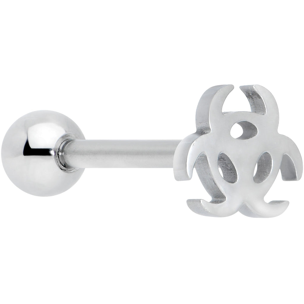 Whether you're worried about pollution or just love metal music, this 14 gauge tongue jewelry shows it with every word! It's made with a 5/8" durable 316L surgical grade stainless steel straight barbell with a 5mm bottom ball end. The top end features a classic symbol for biological hazards, with a simple cut that adds visual impact by not overwhelming your look. If you're into science or want to talk about toxins, this biohazard symbol tongue piercing ring is the only symbol you'll need!Specifications
