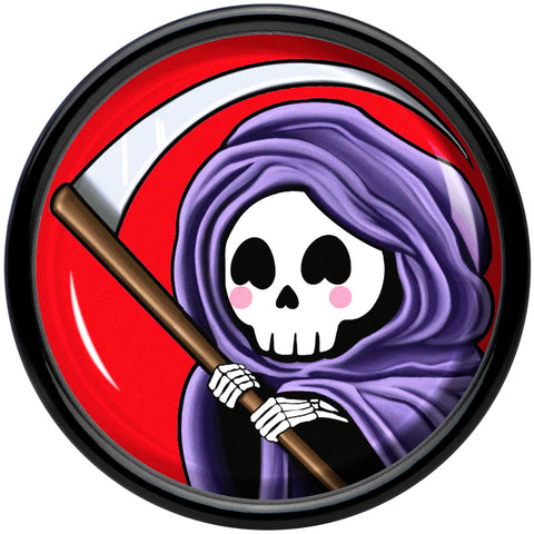 Death to boring ear jewelry - when you are rocking these plugs for stretched lobes. They are made with acrylic and feature a double flare design for secure wear. Each one features a disc shaped grim reaper charm with a vivid red background. The fantasy-styled grim reapers have a purple cloak and curving scythe for a traditional twist. If you are dying for a new look, these colorful double flare plugs for stretched lobes are exactly what you are after. Sold as a set of two.