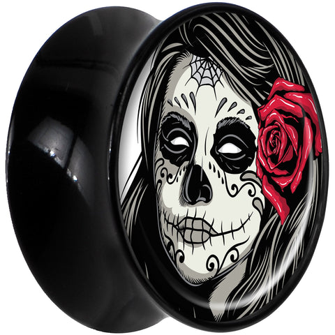 Black Acrylic Katrina Sugar Skull with Rose Saddle Plug Set 5/8"