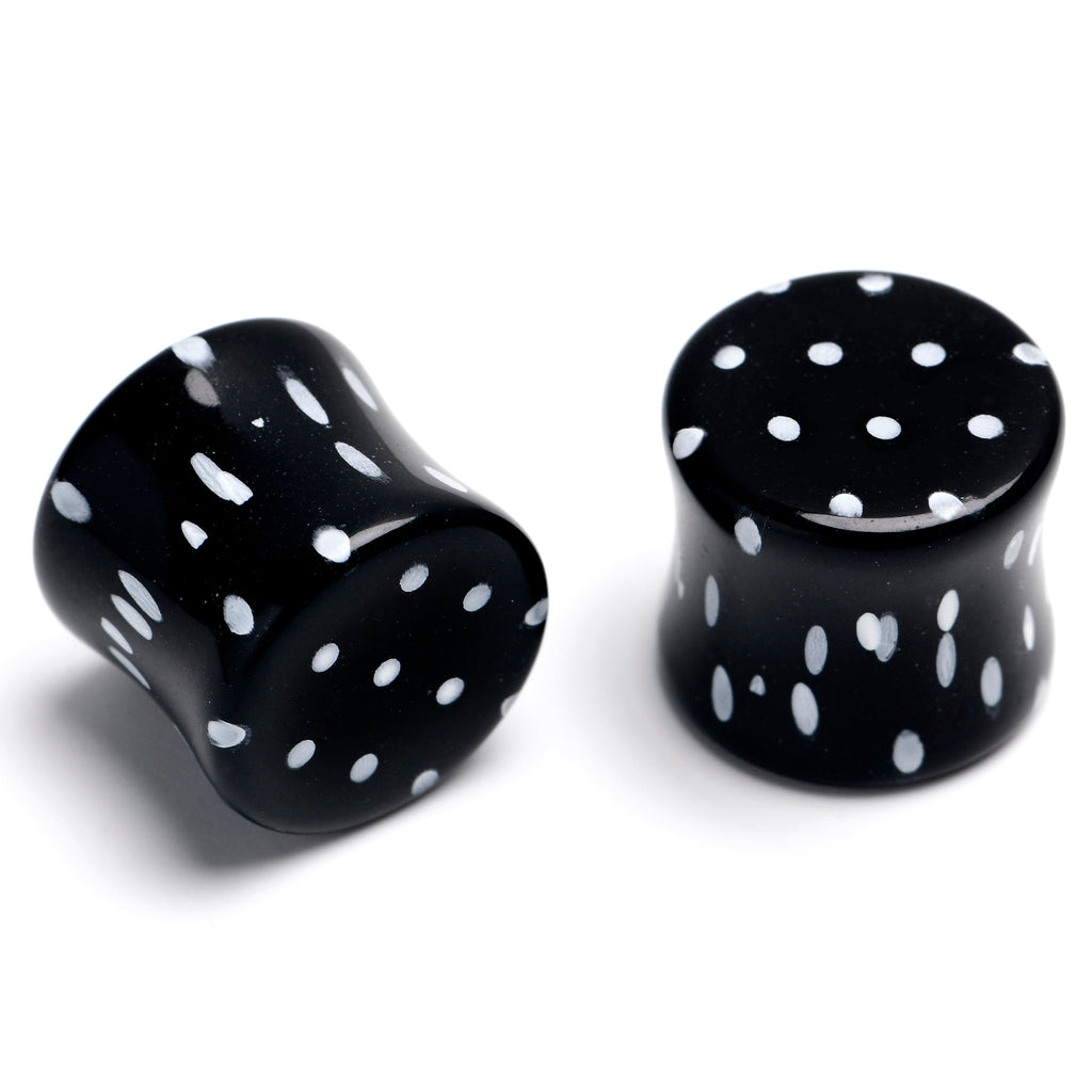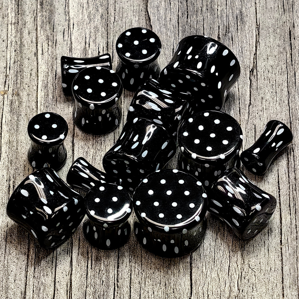 Hypoallergenic jewelry for sensitive skin.Black Acrylic Polka Dots White Double Flare Plug Set