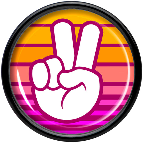 Let your look speak words of peace with these plugs for stretched lobes. They are made with acrylic and features a double flare design for secure wear. The front end features a disc charm of a hand giving the classic peace sign from the 1960s. The hand is further embellished with a striped background that shades from purple to orange. You will be feeling the peace and love with these classic peace sign double flare plug earrings. Sold as a set of two.