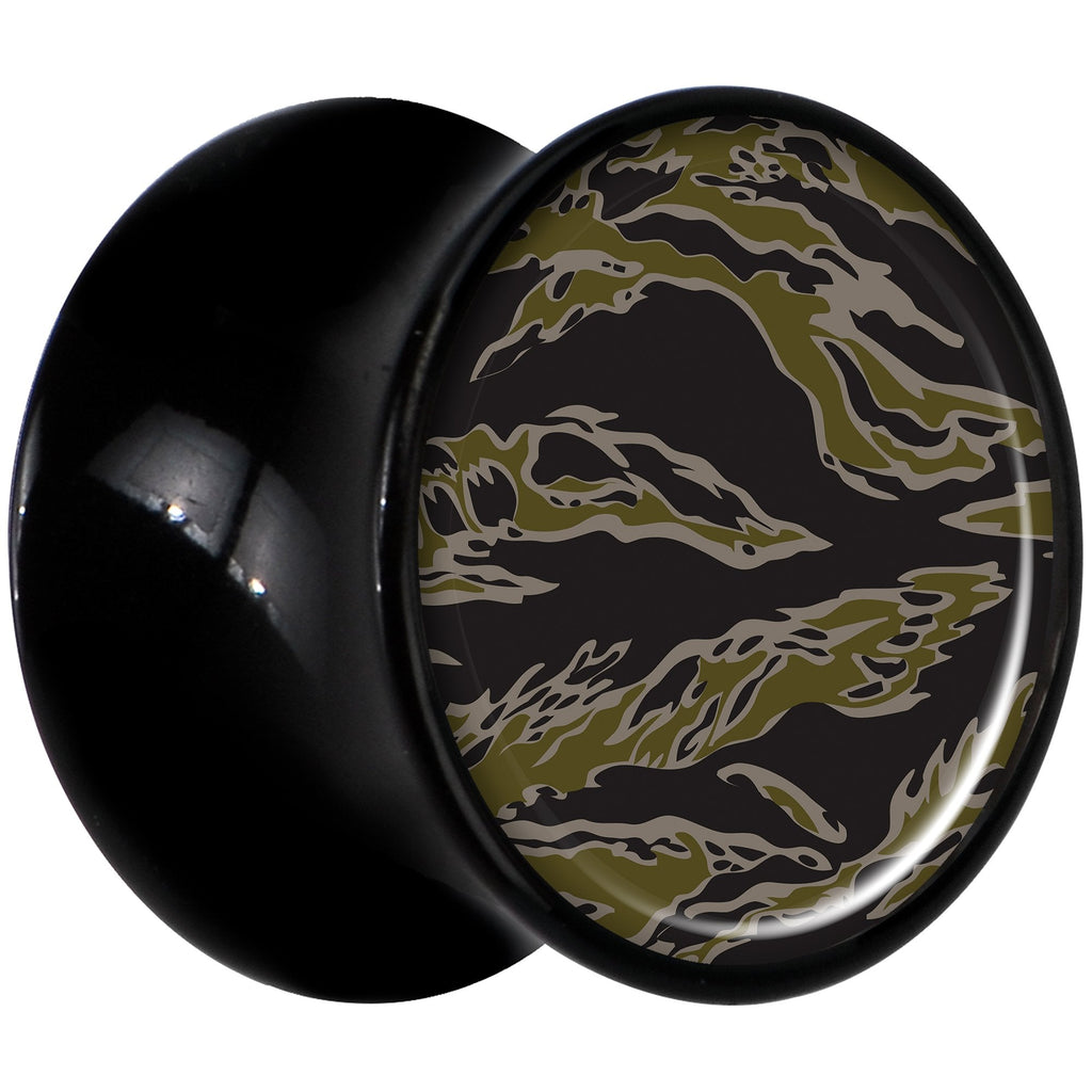 Hypoallergenic jewelry for sensitive skin.Black Acrylic Tiger Camo Print Saddle Plug Set 1/2"