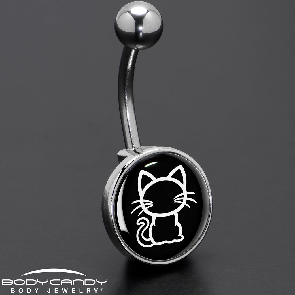Keep it simple while keeping it as adorable as the kitty cat on this 14 gauge navel ring. It's made with a 7/16 inch 316L surgical grade stainless steel curved barbell with a 5mm top ball end. The bottom end features a cat charm. The cat is styled with the simplest of detailing in white against a black background for visual impact. You'll be ready to purr like a pussycat with this fabulous feline belly piercing jewelry.