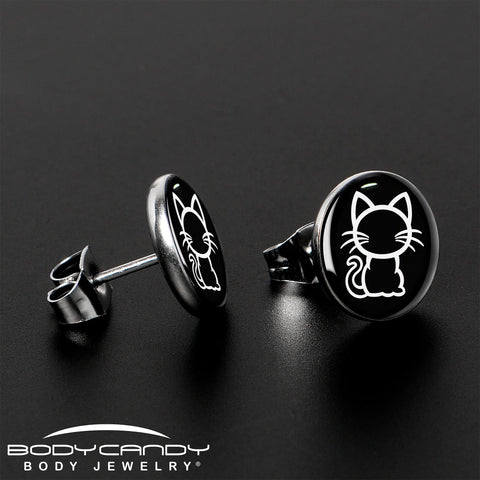 Keep it simple while keeping it as adorable as the kitty cat on these earrings for pierced ears. They're made with stainless steel straight posts with friction backs for a secure fit. Each one features a cat charm. The cats are styled with the simplest of detailing in white against a black background for visual impact. You'll be ready to purr like a pussycat with these fabulous feline stud earrings. Sold as a set of two.