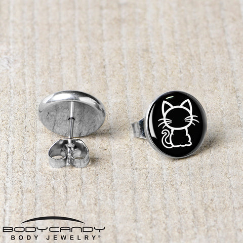 Hypoallergenic jewelry for sensitive skin.Black and White Kitty Cat Stud Earrings