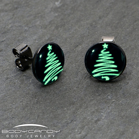 Hypoallergenic jewelry for sensitive skin.Black Anodized Glow in the Dark Holiday Christmas Tree Stud Earrings