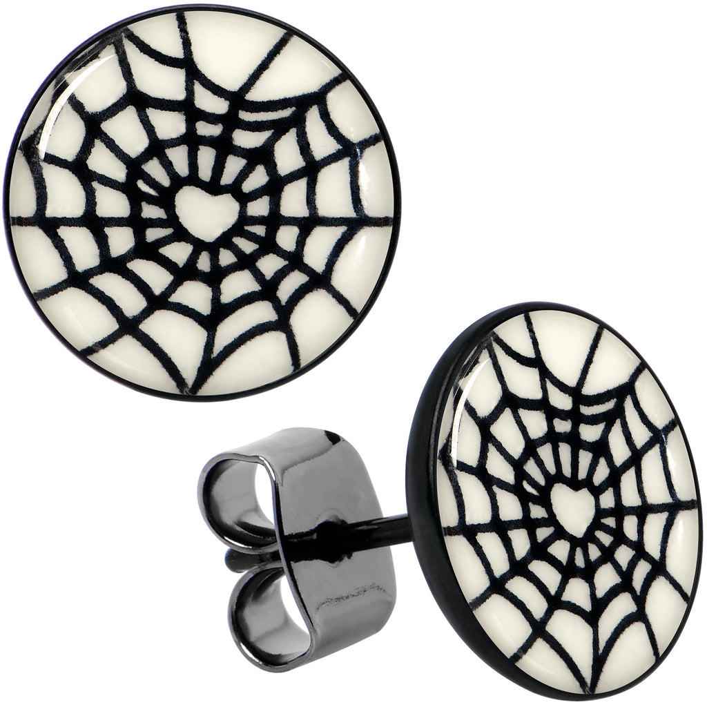 Weave a web of gothic style with these stud earrings for pierced ears. They are made with black anodized over stainless steel straight posts with friction backs for a secure fit. They each feature a white charm of a black spider web with a heart woven into the center. Best of all, when you turn down the lights they glow in the dark. Fall in love with these creepy crawly arachnid themed pierced earrings. Sold as a set of two.