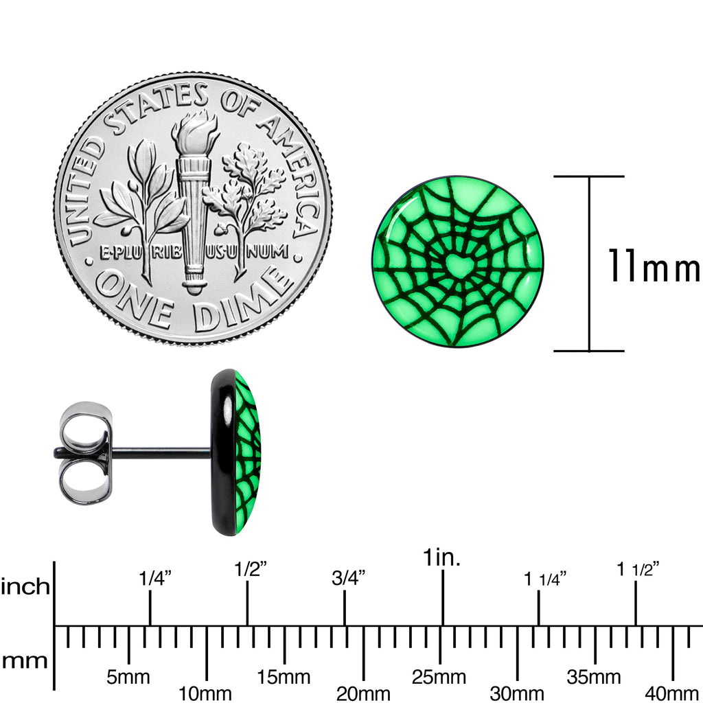 Hypoallergenic jewelry for sensitive skin.Black Anodized Steel Heart Spider Web Glow in the Dark Stud Earrings