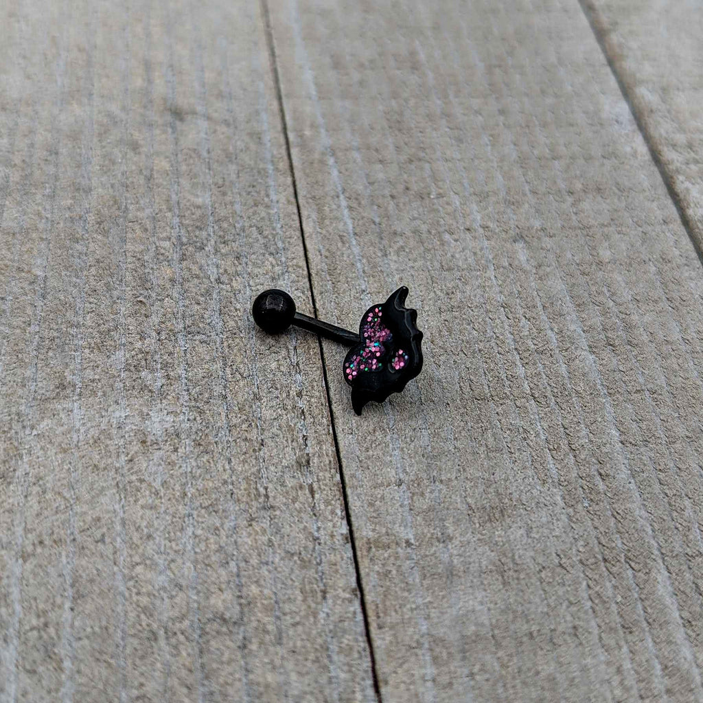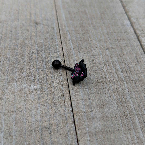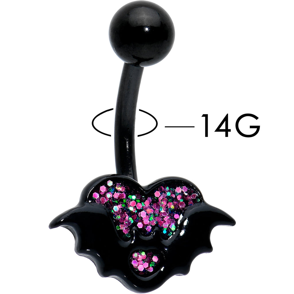 This Halloween, let a bat steal your heart with this 14 gauge navel ring! It's made with a 3/8" black PVD over 316L surgical grade stainless steel curved barbell with a 5mm top ball end. The bottom end features a pink and green embellished heart charm, with a flying bat at the bottom. This belly piercing ring is sure to make your heart soar!Specifications