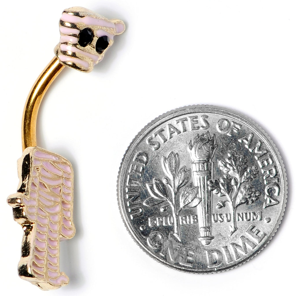 Start your Halloween shopping with this monster movie-inspired 14 gauge navel jewelry that has scary style. Made with a 3/8" gold tone PVD over 316L surgical grade stainless steel curved barbell, this navel piercing features a mad mummy with bandage-wrapped details whose head is the top charm set with black gem eyes and a mummy body bottom charm that will scare the neighborhood kids but good.Specifications