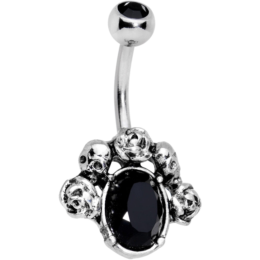 Grab some year 'round Halloween style with this 14 gauge navel piercing. Mounted on the bottom rim of this belly button ring is a menacing black gem surrounded by a pile of five spooky skulls to give a dark twist to your mysteriously intriguing pierced look. This belly ring is 7/16" in length, is made with a durable 316L surgical grade stainless steel curved barbell, and features a top black gem.