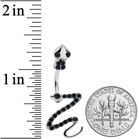 Give your navel piercing a slithery, sexy new look with this 14 gauge navel ring! It's made with a 3/8" durable 316L surgical grade stainless steel curved barbell. One end features a snake's head, set with black gems and embellished with matching black gem eyes. The other end features a full-length, curving snake, also set with black gems along the body and with a matching black gem eye. If you're smitten with snakes or or think reptiles rock, this stylish snake belly button jewelry is sure to please!Specifications