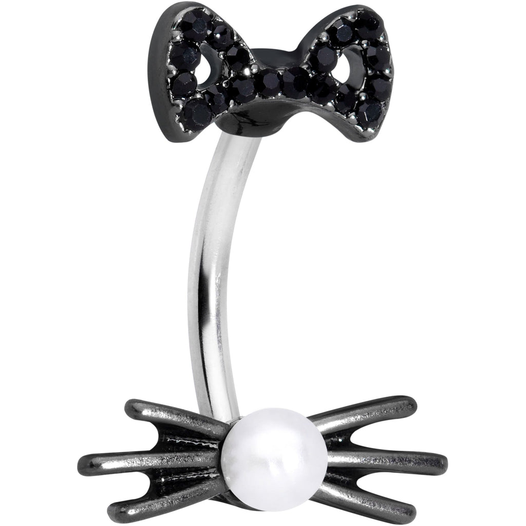 If you're into spooky style and love cats too then this 14 gauge Halloween belly button ring is going to be your new favorite! Made with a 7/16" durable 316L surgical grade stainless steel curved barbell, this navel ring features a black cat ears top charm with black gems as well as a cat whiskers bottom charm set with a white orb. It's purrr-fectly scary!Specifications