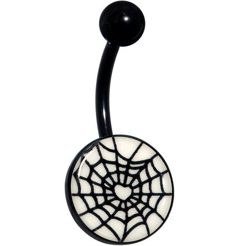 Weave a web of gothic style with this 14 gauge navel ring. It is made with a 7/16 inch black anodized titanium over 316L stainless steel curved barbell with a 5mm top ball end. The bottom end features a white charm of a black spider web with a heart woven into the center. Best of all, when you turn down the lights it glows in the dark. Fall in love with this creepy crawly arachnid themed belly piercing ring.