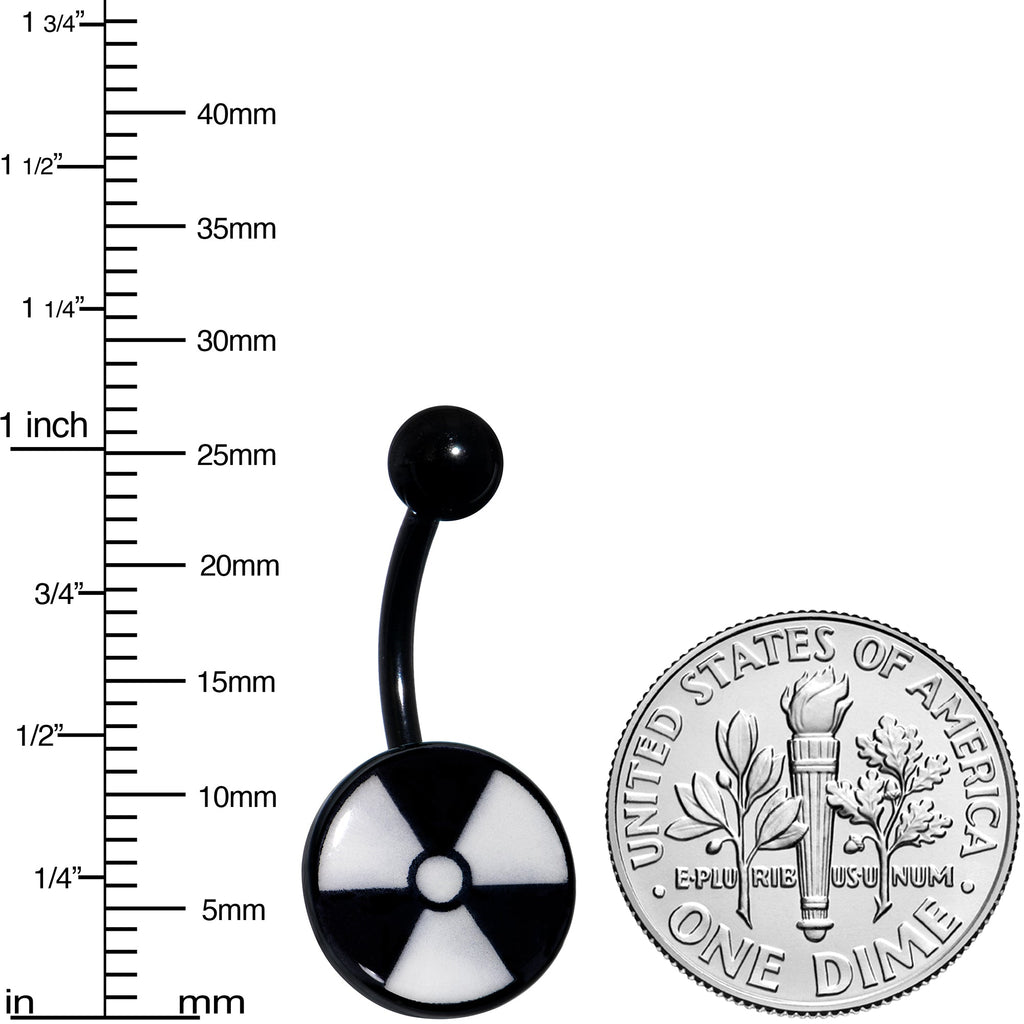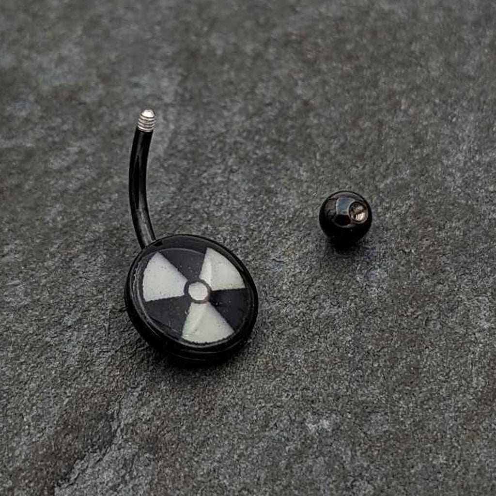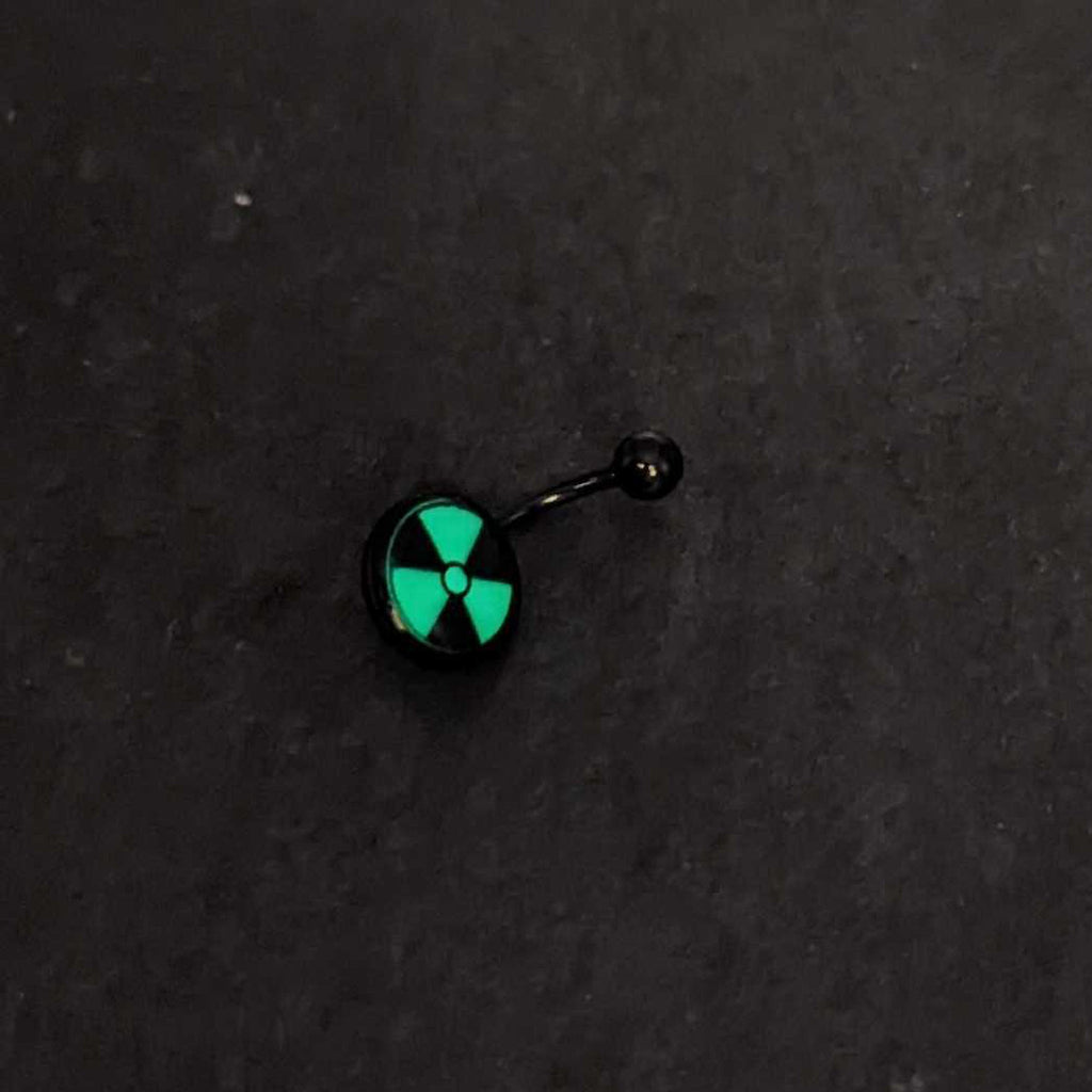 Hazardous and Glowing radioactive symbol belly button ring. This non dangle radioactive navel piercing features an anodized curved barbell and fun glow in the dark logo inlay.