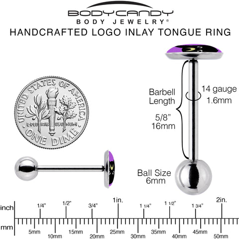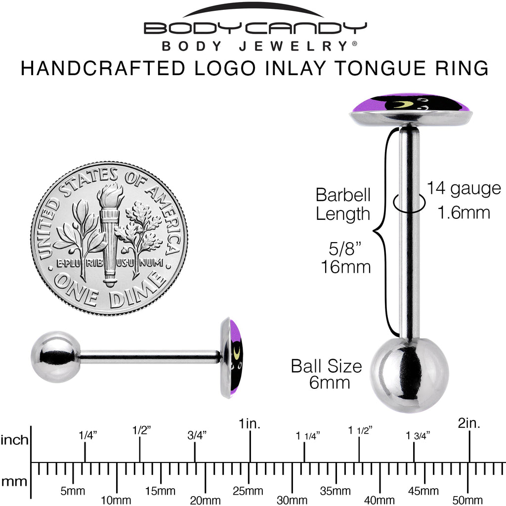 The cat on this 14 gauge tongue ring appears to have been blessed with mystic wisdom. It's made with a 5/8 inch 316L surgical grade stainless steel straight barbell with a 6mm bottom ball end. The top end features a purple disc charm with a black cat's face on it. The cat has simply detailed eyes and a crescent moon on its forehead. Let this cryptic kitty cat cast a spell of style on your look with this delightfully mystical tongue piercing jewelry.