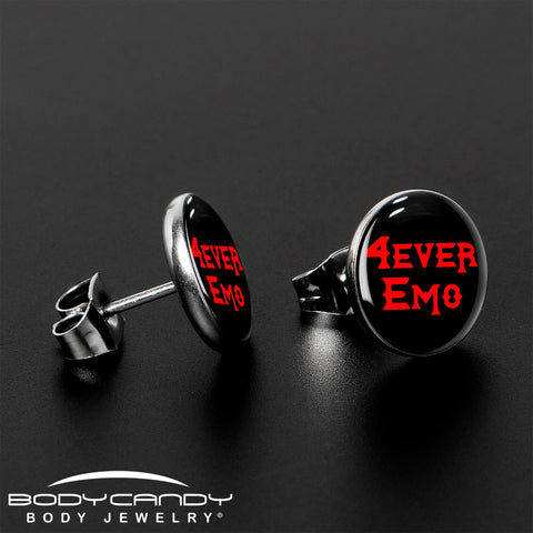 If you're emo and you love it, show it off with these stud earrings for pierced ears. They're made with stainless steel straight posts with friction backs for a secure fit. Each one features a black disc logo charm with 4ever emo written in stylized red letters for some serious visual impact. It's not just a phase when you're rocking these delightfully dark pierced earrings. Sold as a set of two.