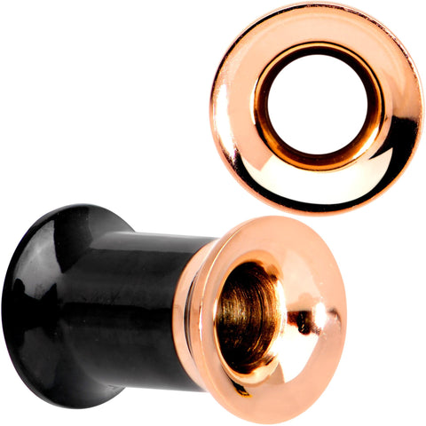 Add some shine to those boring old tunnel plugs These tunnel plugs will add a little bit of style. These plugs are made with black PVD over 316L surgical grade stainless steel, and feature a rose gold PVD screw fit backing. This pair of plugs is made with a screw fit design for easier insertion and removal and is sold as a set of two for you. NOTE: Prices of plugs may vary based on plug ear gauge size selected from drop down. Specifications