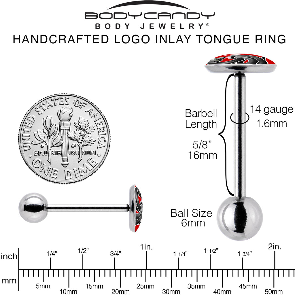 Add some slithery, scaly style to your look with this elegantly styled 14 gauge tongue jewelry. It is made with a 5/8 inch 316L surgical grade stainless steel straight barbell with a 5mm bottom ball end. It features a red disc with a black snake on it. The snake is coiled up, with its head raised as if to strike. If your look is ripe for some reptilian additions, this tongue piercing ring totally fit the bill.