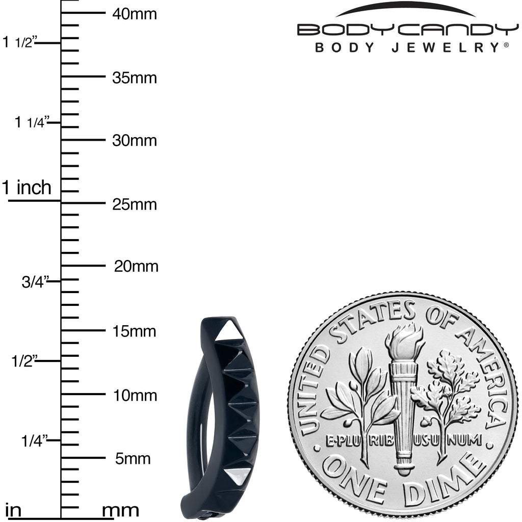 Get hardcore about style with this 14 gauge navel ring. It is made with a 3/8 inch black PVD over 316L surgical grade stainless steel hinged circular ring. It features a forward facing row of three dimensional pyramid embellishment for a classic look of punk rock style. It also features a non-removable, hinged segment that makes insertion and removal a breeze. You can face the day looking punk and perfect with this stylish alternative belly piercing jewelry.Specifications