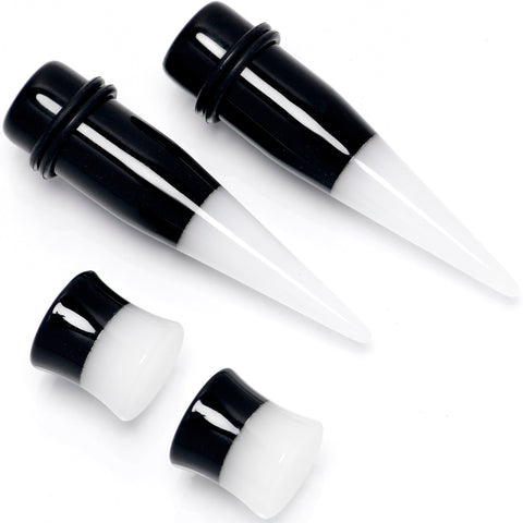 Hypoallergenic jewelry for sensitive skin.Black White Acrylic Glow in the Dark Taper Saddle Plug Set 8mm to 16mm Sizes