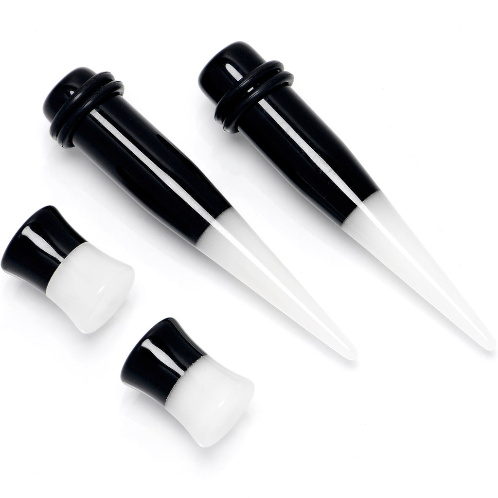 If your ears are eager for an expansion, these straight tapered plugs may be able to satisfy your desires. These ear gauges are made with lightweight acrylic and feature a striking black and white ombre design. They come with rubber o-rings for secure wear. You will also receive a matching set of black and white ombre acrylic plugs, with a saddle design for comfortable insertion and removal. And when the lights go down, this ear expansion jewelry glows in the dark! Stretch your lobes in style with these matching tapers and plugs. Sold as a set of fourSpecifications