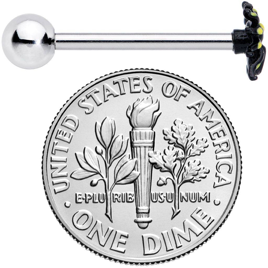 This is no itty-bitty spider! This 14 gauge tongue jewelry is made with a 5/8" durable 316L surgical grade stainless steel straight barbell with a 5mm bottom ball end. The top end features a black spider top charm with yellow embellishment that really makes it pop! The tarantula has individually detailed legs that offer added realism for an overall look that's perfect for Halloween! You're sure to adore this arachnid!Specifications