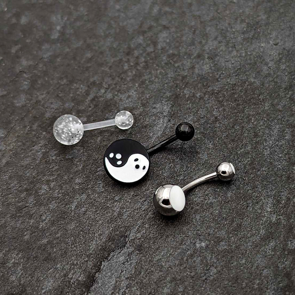 14 Gauge (1.6mm) 3/8" (10mm), 316L Surgical Grade Stainless Steel Curved Barbell, Set includes 1 Glow in the Dark Belly Ring with an 8mm bottom ball with Glow in the Dark Insert, 1 Acrylic Clear Glitter Ball Belly Ring and 1 Ghost Glow in the Dark Ying Yang Sympol Logo Inlay Belly Ring