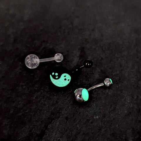 Together the ghosts on this 14 gauge Halloween navel ring make up the jewelry universe! You get one 3/8" durable 316L surgical grade stainless steel curved barbell with a 5mm top ball end. The bottom ball end is 8mm and set with a white embellishment that glows in the dark. The second belly button ring is made with a 3/8" clear flexible Bioplast curved barbell with a 5mm top ball end and an 8mm bottom ball end. The ball ends are clear acrylic and set with glitter for some subtle style. The third one is made with a 3/8" black PVD over 316L surgical grade stainless steel curved barbell with a 5mm top ball end. The bottom end features a yin yang charm, composed of a pair of ghosts in black and white. They even glow in the dark! Get your glow on this Halloween with the spiritual spirits on this belly piercing ring! Sold as a set of three.Specifications