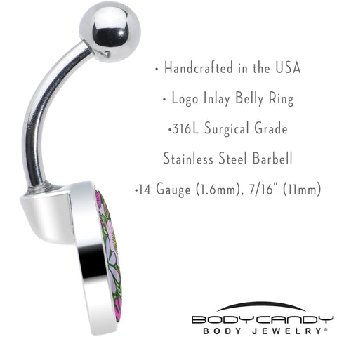 This 14 gauge artist hand drawn flower belly ring jewelry is part of our new line of Blossom Creations body piercing jewelry for the season. This 7/16 inch navel ring is made with a 316L surgical grade stainless steel curved barbell with a 5mm top ball end. The bottom end features a logo inlay charm with a whimsical design of pinkish and purplish retro flowers in a field of fun. You'll be in paradise with this delightfully retro floral belly piercing jewelry.