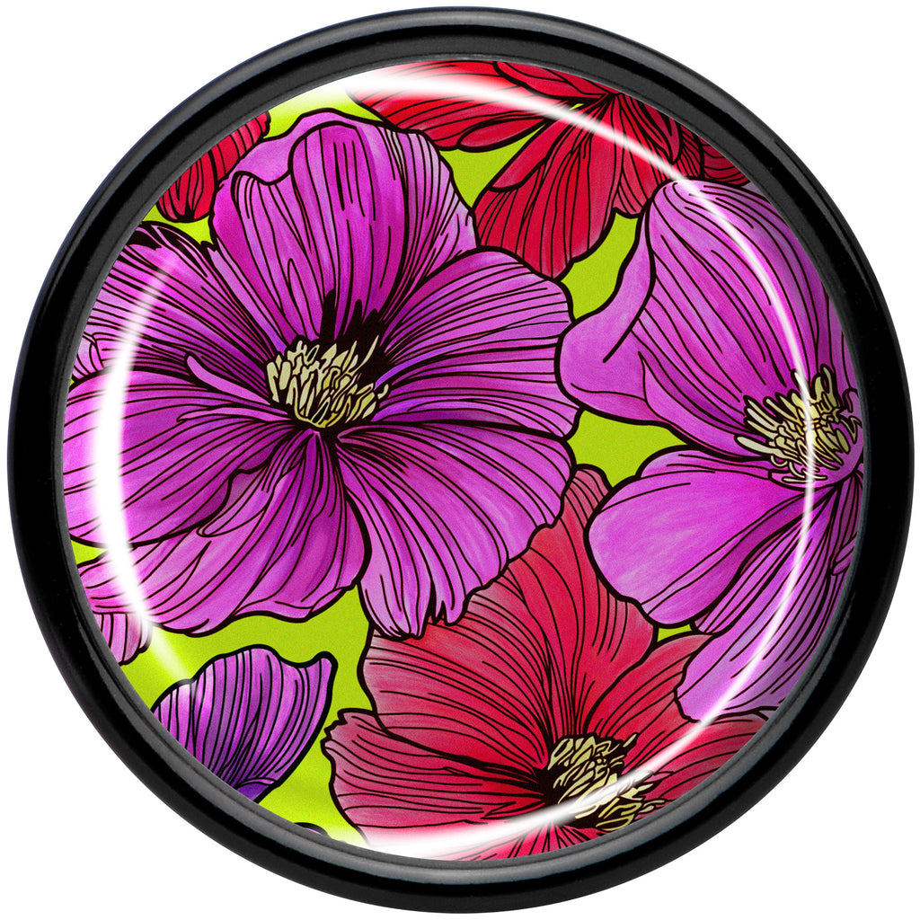 This artist hand drawn flower jewelry is part of our new line of Blossom Creations body piercing jewelry for the season. These plugs for stretched lobes are made with black acrylic and feature a saddle design for comfortable insertion and removal. Each one features a logo inlay charm with rich purple and red flowers, on a contrasting background for a striking look. Bring on the heat with the exotic beauty of these floral ear gauges. Sold as a set of two.