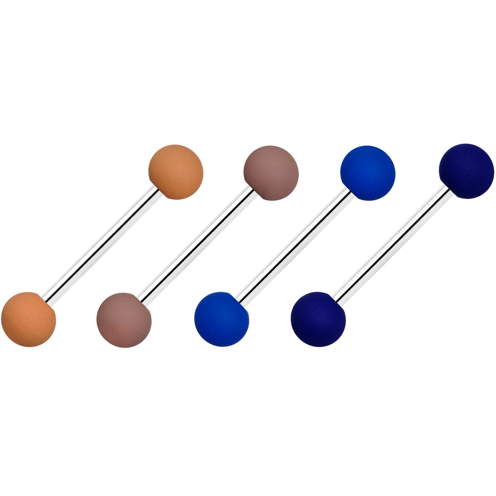 If you're looking for a subtler appearance for your tongue piercing but don't want to sacrifice a colorful look, this set of 14 gauge tongue jewelry has you covered! It's made with 5/8" durable 316L surgical grade stainless steel straight barbells with 5mm ball ends. The ball ends have a softly matte finish that gives them a less conspicuous appearance and you get one each in perfectly autumnal shades of navy blue, medium blue, brown, and tan. Get your tongue piercing ready for fall without overwhelming your look with this marvelous matte tongue jewelry! Sold as a set of four.Specifications