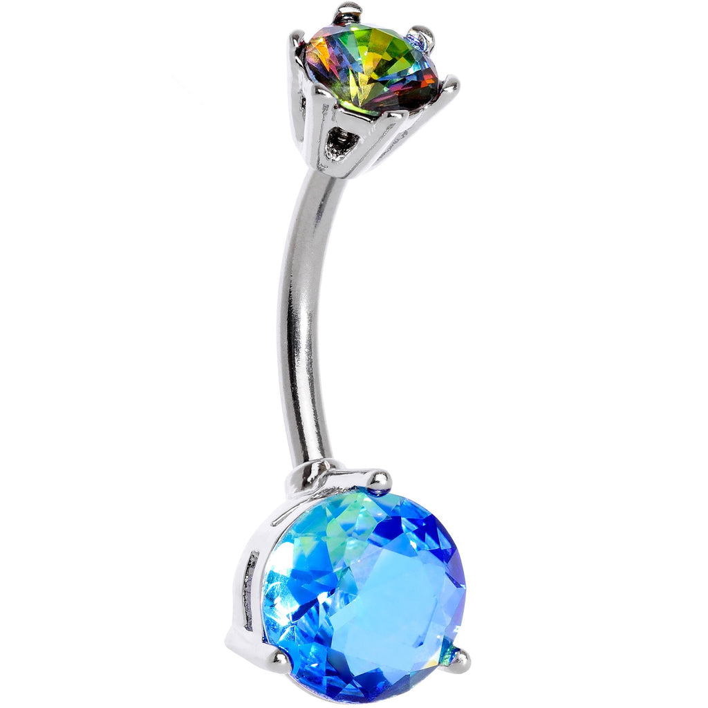 Simple never has to mean plain and this 14 gauge navel ring is proof of that! It's made with a 7/16" durable 316L surgical grade stainless steel curved barbell for comfort and longevity. It has a 5mm top end and an 8mm bottom end, both of which are prong set with elegant gems. The bottom one is purple with a blue shift and the top is a coordinating aurora. These add an arresting pop of color and a huge punch of style while remaining elegantly simple and understated. Simply stunning.Specifications