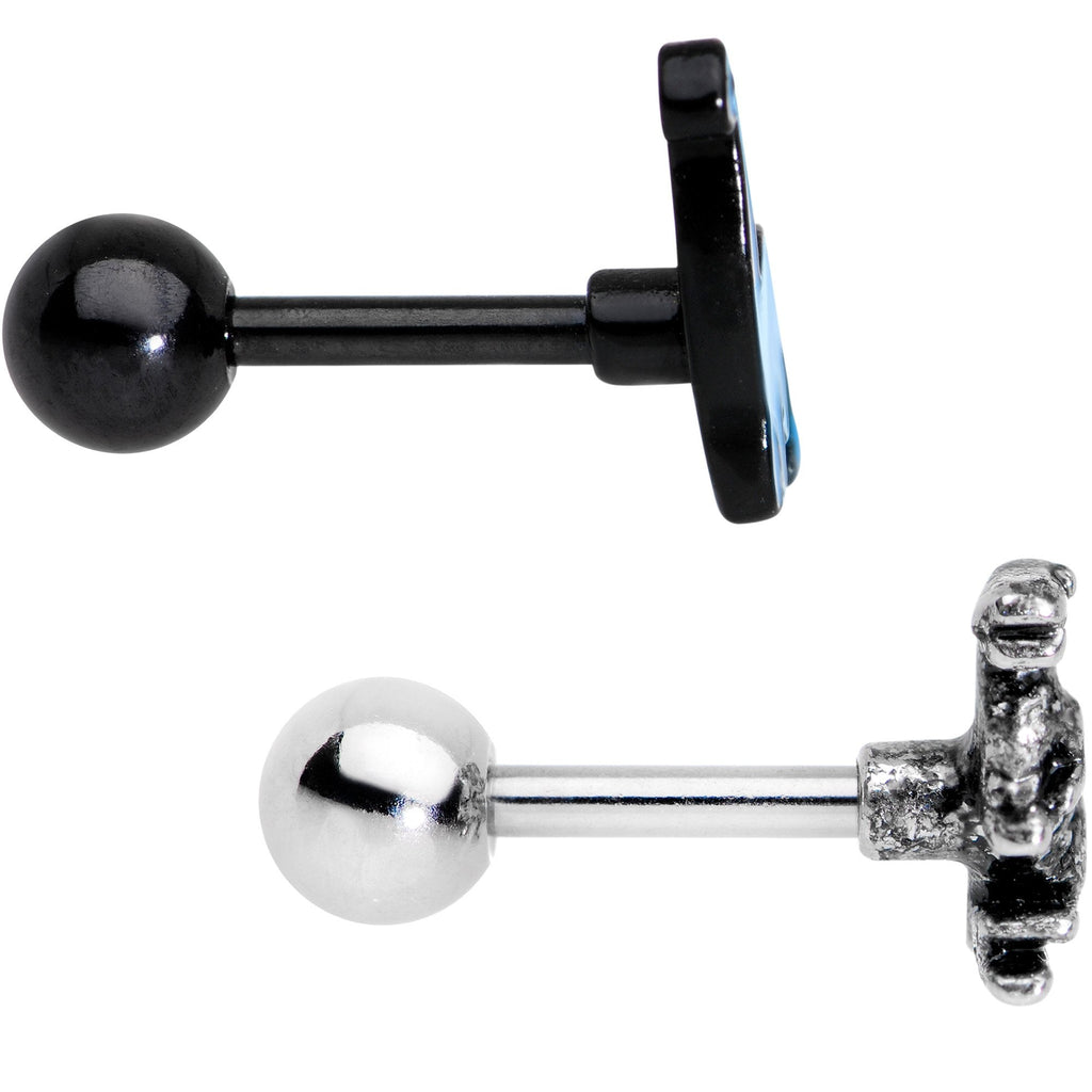 What's better than one dino? Two dinos! Now you can add both of these bodacious dinosaurs to your collection. This set of two cartilage tragus earrings features a bright blue brontosaurs set on a 14 gauge straight barbell made with 1/4" durable 316L surgical grade stainless steel as well as a boney raptor charm mounted on a 14 gauge straight barbell made with 1/4" durable 316L surgical grade stainless steel. Don't let these dinos get away! Sold as a set of two.