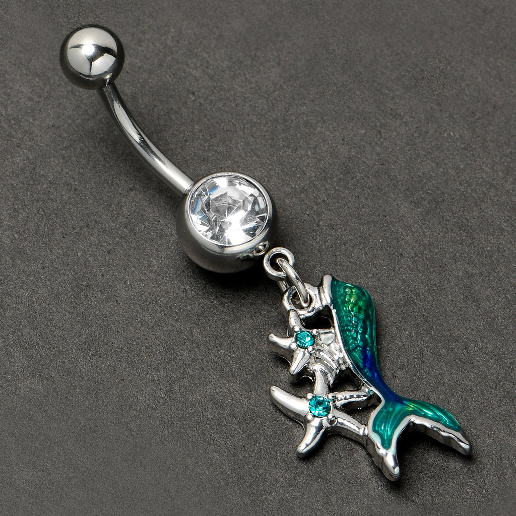 Be the star of sea and of land with this 14 gauge navel ring. It is made with a 3/8 inch 316L surgical grade stainless steel curved barbell with a 5mm top ball end. The bottom ball end is 8mm and set with a large clear gem. Dangling beneath it is a green and blue inlaid mermaids tail charm. It is further embellished with a pair of starfish, set with blue gems at their centers. Let your look tell a tale with a tail, when you are rocking this marvelous mermaid belly piercing jewelry.Specifications