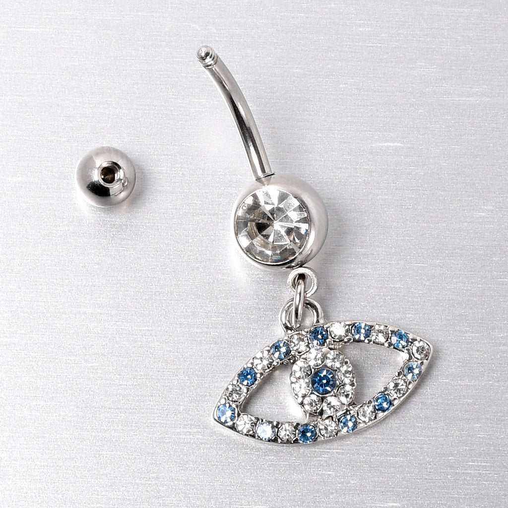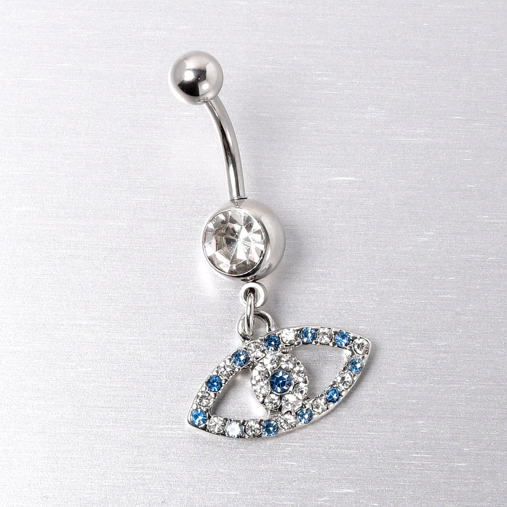 Keep your eyes open and you will spot amazing things - like this 14 gauge navel ring. It is made with a 3/8 inch durable 316L surgical grade stainless steel curved barbell with a 5mm top ball end. The bottom ball end is 8mm and set with a clear gem.Dangling beneath is an eye charm, with the rim paved in blue and clear gems. The center of the eye features more clear and blue gems for a cohesive look. You will have all eyes on you with this eye-opening belly piercing ring.Specifications
