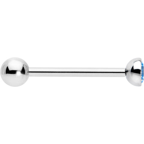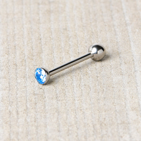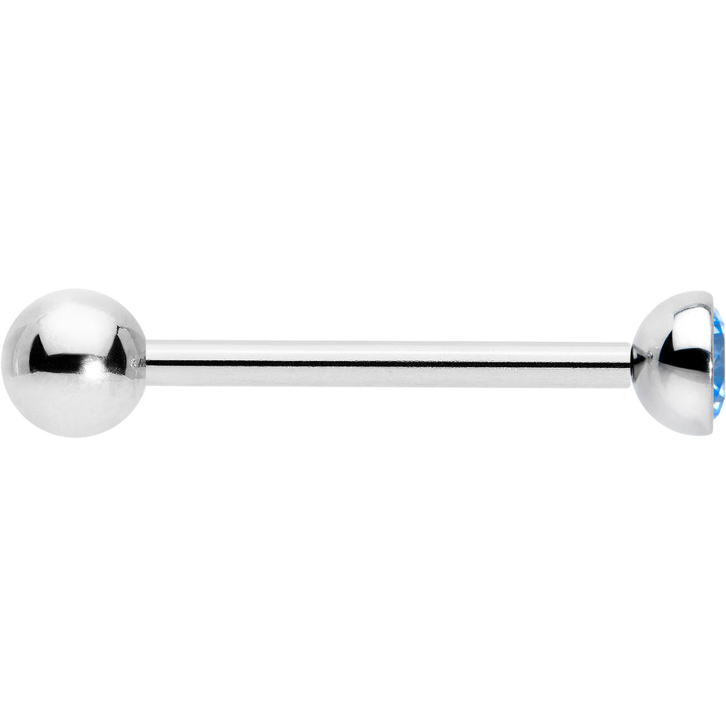 Add color and style to your words without sacrificing quality with this 14 gauge tongue jewelry! It's made with a 5/8" ASTM F-136 titanium straight barbell with a 5mm bottom ball end. The top end is set with a blue cubic zirconia gem set disc that adds an on-trend touch to a simple style. It also features a threadless design for maximum comfort and ease of insertion. You'll have them hanging on your every word with the simple elegance of this tongue piercing ring!Specifications