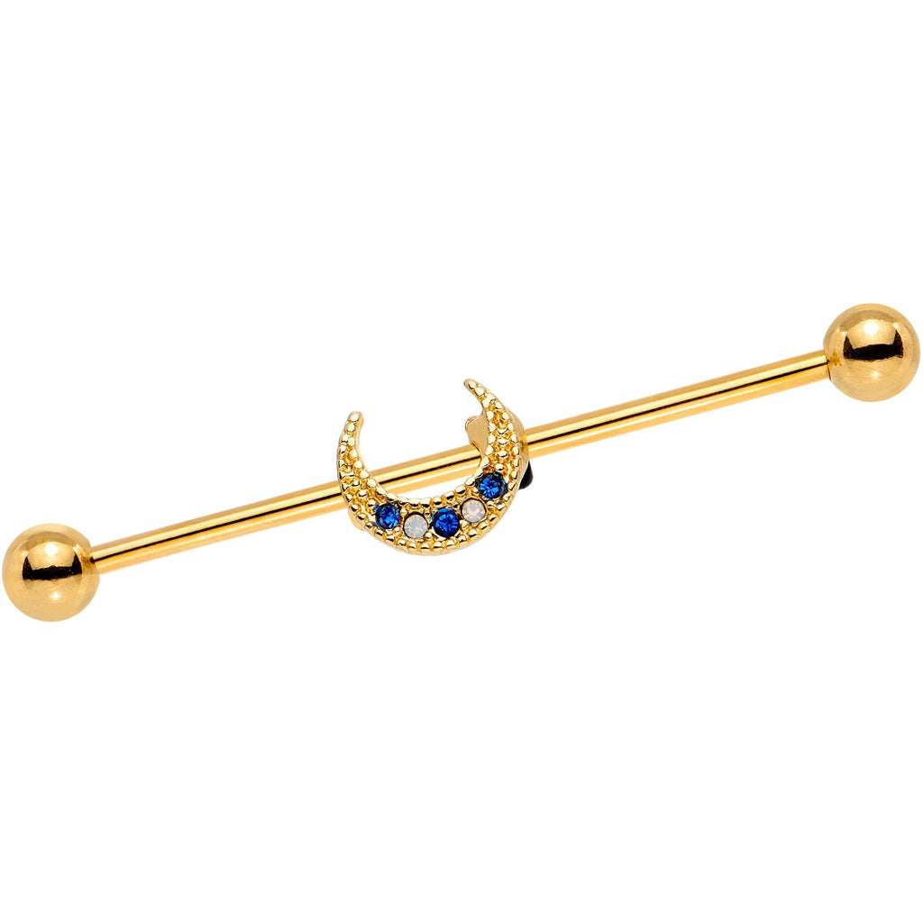 The moon represents the rhythm of time. Be aware of your time on this planet when you wear this mystical upward facing crescent moon industrial barbell. This unique 14 gauge industrial piercing features a gold tone crescent moon charm encrusted with blue and clear cubic zirconia gems. The omveable moon charm is mounted on a straight barbell made with 1 1/2" gold PVD over 316L surgical grade stainless steel.