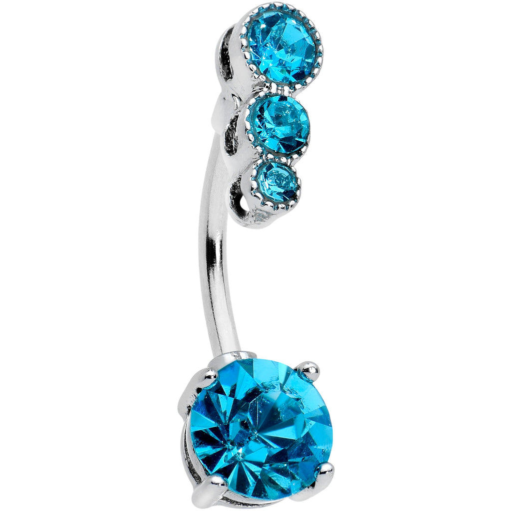 This rockin' round beauty is going to make you fall in love with your navel piercing with this 14 gauge navel ring! It's made with a 3/8" durable 316L surgical grade stainless steel curved barbell. The top features a trio of round blue cubic zirconia gems, set vertically. The bottom end features a round charm, entirely composed of a single blue cubic zirconia gem for a luxe and cohesive appearance. Triple your style with this fashionable and fabulous belly button jewelry!Specifications