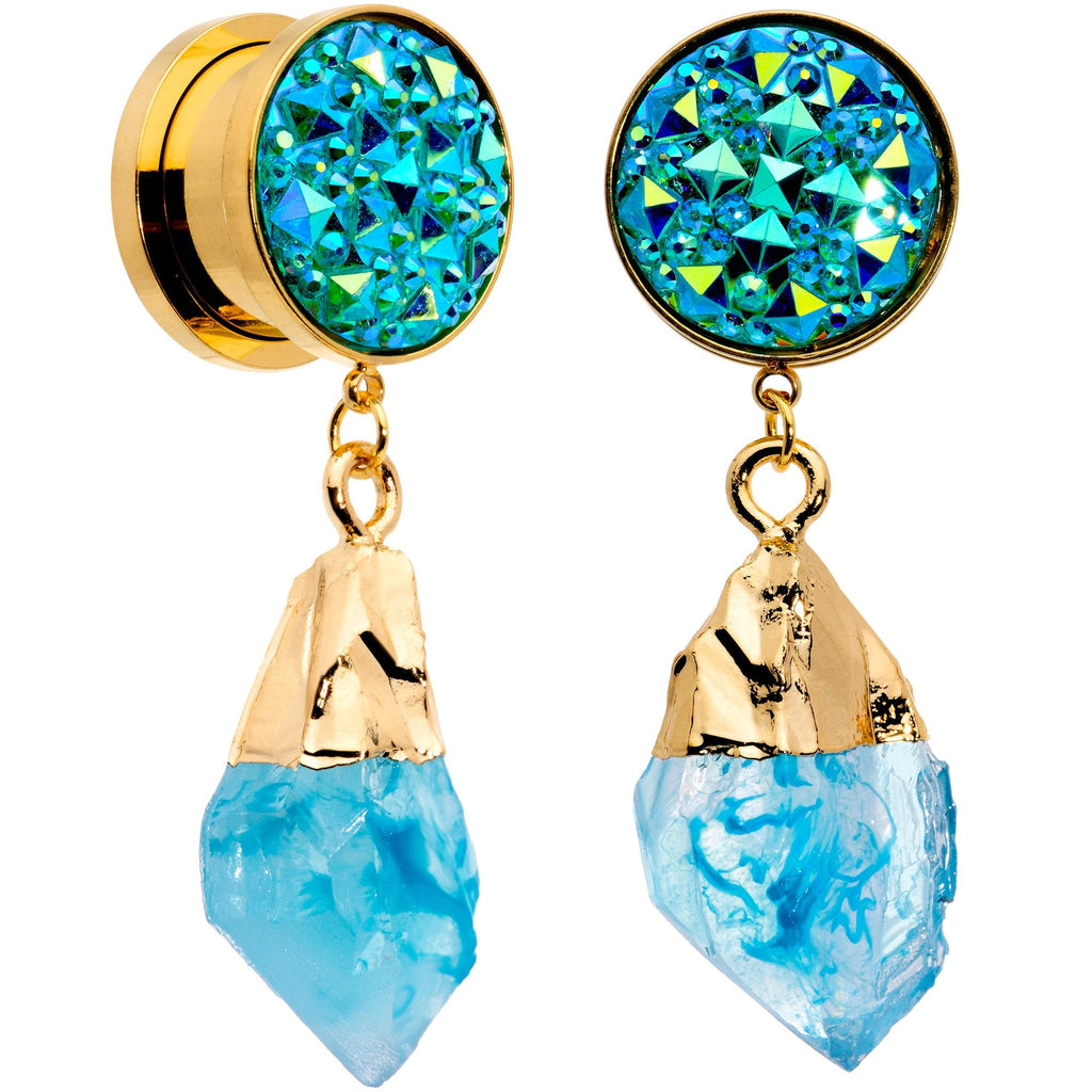 Gazing at the many shades of blue contained in this pair of dangle plugs will make you feel like you've magically gone to the beach! Made with gold tone anodized over 316L surgical grade stainless steel, these ear gauges feature faceted blue inlays as well as a teal faux druzy quartz dangles and have a screw fit design for secure wear. Sold as a set of two. NOTE: Prices of plugs may vary based on plug ear gauge size selected from drop down. Specifications